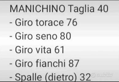 Lunghezza 65, spalle 42, maniche 68, colletto alto 15, torace 41, vita 38, fianchi 48, leggermente estensibili Manichino tg.40 S vedi foto misure