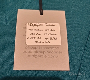 Maglione da donna scollo a V blu/verde taglia S - M cashmere, lana e seta nuovo con etichetta il maglione è un colore fra il verde e il blu-in base alla luce delle foto cambia la tonalità.