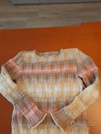 Maglione fatto a mano, girocollo, taglia 46, colore beige/bianco/rosa.