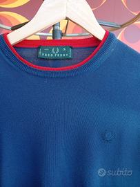 Maglione Fred Perry blu con dettaglio rosso sul collo e logo ricamato. Stile semplice ed elegante, perfetto per uso quotidiano o look casual. Ottime condizioni. TAGLIA S Misure: Spalla 39cm Torace 47cm Lunghezza 58cm Manica 63cm