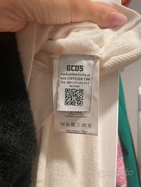 Maglione originale GCDS, modello crop a collo alto, colore bianco panna, con logo in rilievo sul petto.