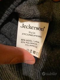 Maglione girocollo Jeckerson in lana, colore grigio scuro con ricamo frontale rosso acceso. Polsi e vita elasticizzati per una vestibilità confortevole. Il filato presenta fori e tagli decorativi che donano al capo un carattere street e grintoso.