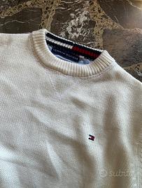 Maglione originale Tommy Hilfiger, colore bianco panna con iconico logo bandiera ricamato sul petto. Perfetto sia per outfit eleganti che casual, ideale per università, lavoro o uscite. Vestibilità comoda (regular), tessuto in cotone morbido e traspirante, piacevole da indossare in ogni occasione. Design minimal e pulito, facilmente abbinabile con qualsiasi outfit. 🔹 Girocollo classico 🔹 Logo bandiera ricamato sul petto 🔹 Polsini e fondo elasticizzati 🔹 Stile minimal / casual / elegante 🔹 Perfetto per tutte le stagioni ✔️ Condizioni: Ottime ✔️ Taglia: L Capo versatile, sempre attuale e facilissimo da abbinare 🔥