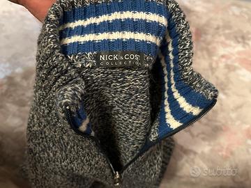 Maglione grigio in tweed, usato. • Taglia: M; • Colore: Grigio/Blu/Bianco; • Chiusura collo con zip; • Collo alto; • Composizione: 50% Lana / 50% Acrilico; • Motivo con trama greca.
