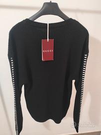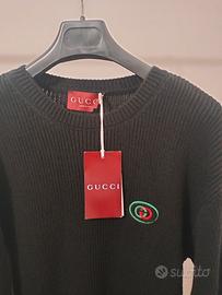 Maglione girocollo Gucci in maglia nera. Presenta un logo ricamato sul petto e dettagli a contrasto sulle maniche.