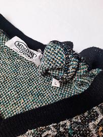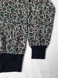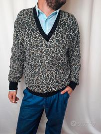 Bellissimo maglione in cotone firmato Missoni Uomo, made in Italy. Iconico motivo multicolor con disegno di tanti volti stilizzati. Tessuto morbido, vita e polsini elastici. Collo a V. Articolo vintage anni '80/90, usato ma ancora in ottime condizioni. Taglia riportata L, il ragazzo in foto è M/L. Misure prese sulle cuciture: lunghezza 71cm, spalle 52, manica 66, torace 59.