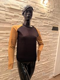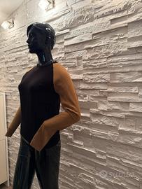 Elegante maglione a girocollo con design bicolore: corpo nero e maniche color cammello. Un capo versatile, perfetto sia per outfit casual che per un look più sofisticato. Taglie disponibili dalla S alla XXL