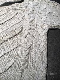 Maglione realizzato interamente a mano,unisex, colore grigio perla, con trecce e motivi tridimensionali,mai indossato, può essere usato anche senza piumino poiché il solo peso del maglione è di 1070 g.
