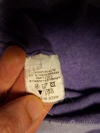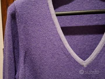 maglioncino leggero caldo..e morbido. Profondo scollo a v. Due toni di viola, bordi lilla. tg M. Cachemire seta lana viscosa. Usato. Vari pelucchi della lana. Misure: spalle cm 36. Petto 40. Lungo 57. Manica lunga 60. Vera occasione. Faccio sconti sui set. Disponibile a incontrarci a Bologna per lo scambio a mano o spedizione veloce