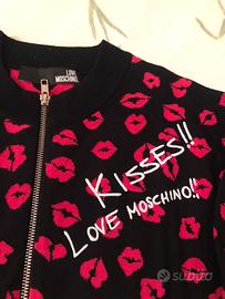 Maglione Love Moschino originale, in misto lana, con lavorazione a labbra all over. Nera con labbra fucsia, interno fucsia. Ricamo Kisses !!! sul petto in bianco. Chiusura con zip. Bordo a costine neri. Collo a giro. Tg M. Ottimo stato