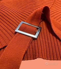 maglione lungo arancione, con cinturino incorporato, apertura frontale, più stretto in vita