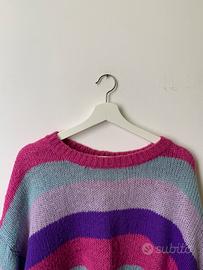 Vendo maglione donna taglia M, morbido e caldo, perfetto per aggiungere un tocco di colore ai tuoi outfit autunnali e invernali. Fantasia a righe viola, lilla, rosa e azzurro, stile allegro e versatile.
