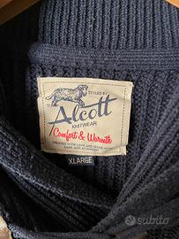 Maglione uomo della Alcott colore blu, con 2 tasche laterali e toppe marrone sui gomiti.
