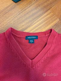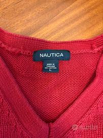 Maglione Nautica originale da uomo, colore rosso acceso, con scollo a V. Modello classico ed elegante, ideale sia per outfit casual che più curati. Tessuto morbido e confortevole, con polsini e fondo a costine. Logo Nautica tono su tono ricamato sul petto.