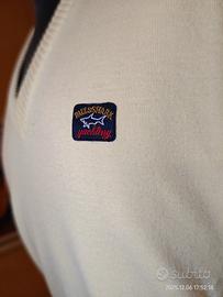 Maglione Paul Shark in color beige, con scollo a V. Presenta un piccolo logo applicato sul petto.