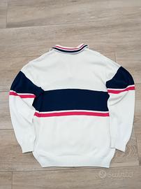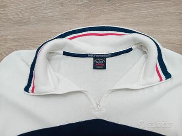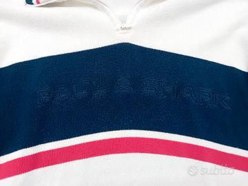 Splendido maglione originale Paul & Shark Yachting, appartenente alla prestigiosa linea Watershed (trattamento speciale idrorepellente del filato). Colore bianco panna con iconiche bande orizzontali blu navy e rosse. -Modello: Mezza zip con colletto alto strutturato. -Caratteristiche: Logo "Paul & Shark" ricamato tono su tono sulla banda blu centrale e classico squalo ricamato in piccolo sul fianco/fondo. -Materiale: Lana di alta qualità (tipica del brand), calda e traspirante. -Condizioni: Ottime condizioni, usato pochissimo. Non presenta macchie, buchi o segni di usura evidenti (come da foto). PREZZO TRATTABILE