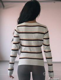 Maglione pesante a righe multicolore con base bianca. - Maniche lunghe. - Girocollo. - Tessuto a costine.