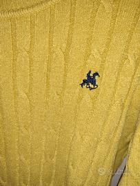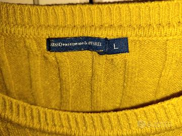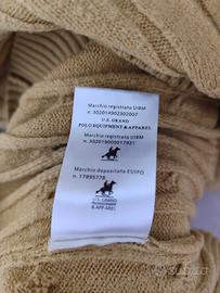 Maglione femminile a girocollo con trama a trecce. Taglia L. Colore senape. - Logo ricamato sul petto. - Maniche lunghe. - Orlo e polsini a costine.