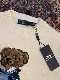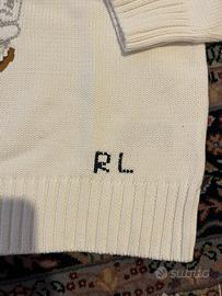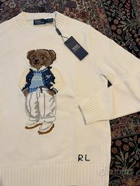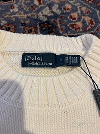 Maglione Polo Ralph Lauren donna taglia S, nuovo con etichetta, 100% cotone. Modello girocollo a lavorazione a maglia, in colore panna/avorio, con iconico orsetto ricamato sul davanti e logo “RL” sul fondo. Capo originale, mai indossato, perfetto per un look casual ma curato. Vestibilità regolare, ideale da abbinare con jeans, pantaloni o gonne per un outfit elegante e contemporaneo.