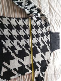 Bellissimo maglione pullover da donna con fantasia houndstooth in caldo tessuto. Elegante, vintage, con una splendida stampa pied de poule in bianco e nero. Un capo elegante e senza tempo, perfetto per l'autunno e l'inverno.