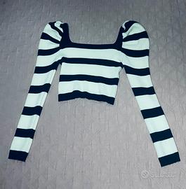 Maglione a righe nere e verde chiaro 🖤💚 con maniche lunghe e spalle a sbuffo ✨. Ha uno scollo quadrato e una vestibilità corta, perfetto per un look moderno e alla moda 👗💫.