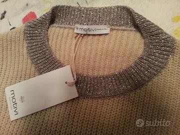 Maglione beige, marca Motivi, Made in Italy, taglia M. Nuovo, mai usato, ancora con il cartellino. Bordo collo, bordo maglione e polsi alti delle maniche con filamenti argentati, e intarsi laterali dai fianchi alle maniche con paillettes scintillanti, sempre argentate. Ritiro al proprio domicilio in Roma, rione Monti/Basilica Santa Maria Maggiore. No ztl