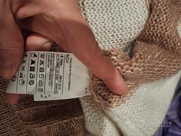 Bello caldo, motivo a righe orizzontali nei toni del bianco e del marrone rosato, con scollo rotondo e vestibilità ampia.