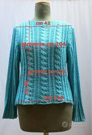 Maglioncino turchese, 3 trecce sul davanti. Portato non molto: ancora in buonissime condizioni. Taglia T 46. Cotone 50% e acrilico 50%