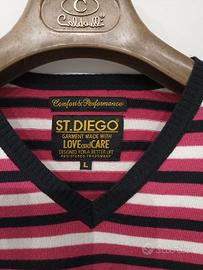 Maglione St Diego con un design a righe orizzontali. Il collo è a V e il fondo e i polsini sono neri.