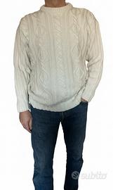Maglione Sutherland color panna/avorio con lavorazione a trecce e motivo geometrico centrale.