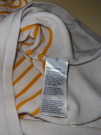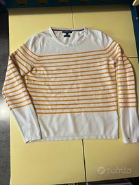 maglione a maniche lunghe di Tommy Hilfiger, caratterizzato da un classico design a righe orizzontali arancioni (o ocra) su fondo bianco.
