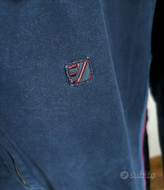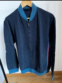 Colore blu navy, con dettagli a contrasto in azzurro su collo e bordi e bande laterali blu/rosa che gli danno un tocco sportivo ma elegante.