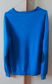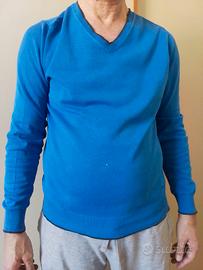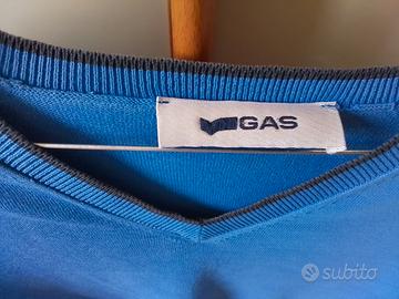 maglione da uomo della Gas in cotone blu. una piccola macchia bianca sul davanti dovuta ad un candeggio. toppe sui gomiti. maglione usato ma in buone condizioni.
