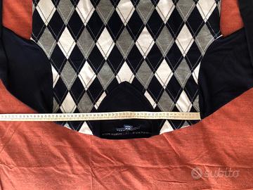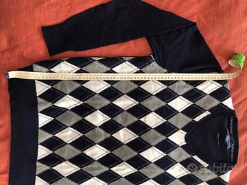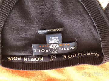Per non utilizzo vendo maglione per uomo North Pole, taglia L, scollo a V, slim fit, tessuto viscose e nylon(vedere foto etichetta), colore blu navy con scacchi sul fronte blu-bianchi-grigi, misure spalle 42cm, altezza 64cm, circonferenza 93cm, braccio 61cm, poco utilizzato in ottimo stato. Nessun segno di usura.