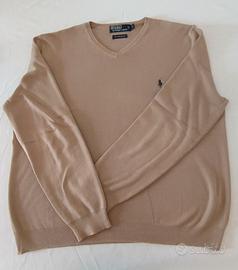 Elegante classico maglione sottile da uomo Ralph Lauren, collo a V, colore beige con stemma verde, 100% cotone. Taglia L (adatto per 50/52). Ottime condizioni come da foto.