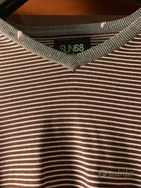 Maglione in morbido cotone, taglia L. Colore marrone e beige a righe ed inserti rosa