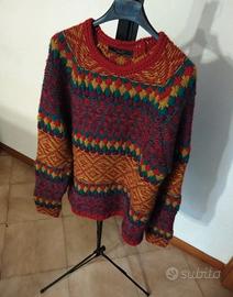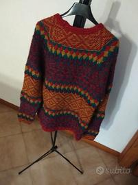 Design: Il maglione presenta un motivo jacquard a righe orizzontali con diverse trame e colori, tra cui rosso, bordeaux, viola, verde e giallo, realizzati in misto lana per garantire calore e comfort durante l'inverno.