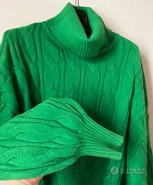 Maglione Verde. Maglione verde con collo alto in maglia lavorata, caldo e super morbido. Modello corto (crop) con vestibilità leggermente oversize e maniche lunghe ampie con polsini aderenti. La lavorazione a trecce sul davanti e sulle maniche lo rende elegante ma perfetto anche per outfit casual. Colore verde brillante, ideale per dare un tocco di colore ai look autunnali e invernali. Sta benissimo con gonne, jeans o pantaloni a vita alta.