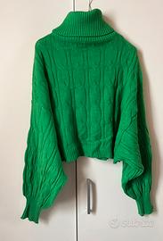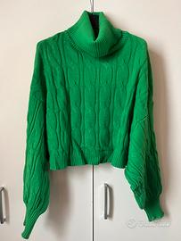 Maglione Verde. Maglione verde con collo alto in maglia lavorata, caldo e super morbido. Modello corto (crop) con vestibilità leggermente oversize e maniche lunghe ampie con polsini aderenti. La lavorazione a trecce sul davanti e sulle maniche lo rende elegante ma perfetto anche per outfit casual. Colore verde brillante, ideale per dare un tocco di colore ai look autunnali e invernali. Sta benissimo con gonne, jeans o pantaloni a vita alta.
