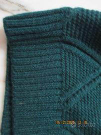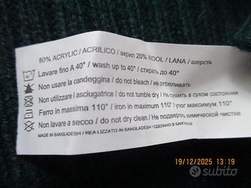 Un maglione dolcevita verde per uomo , con ricamature a rombi , taglia L e composto per il 20% di lana e l' 80% di acrilico, spesso e adatto per l' inverno ; le misure sono le seguenti : 40 cm la base e 70 l' altezza fino alle spalle ; è un articolo quasi nuovo perché mai indossato .