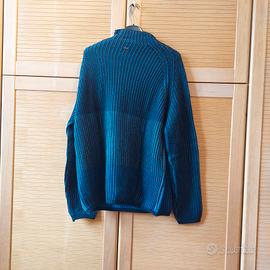 Maglione VERSACE CLASSIC misura XL a righe blu/ azzurro parte sopra piu' scura indossato poche volte particolalarita' ha una zip vicino alla spalla in modo da indossarlo piu' grande o più,' piccolo.