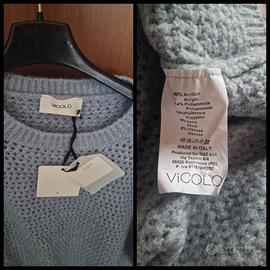 Maglione Vicolo in lana acrilica colore azzurro talco. Tg unica. Lavorazione traforata, spalle scese. Nuovo con cartellino e mai indossato. Lunghezza 51 cm, da ascella ad ascella 60 cm.