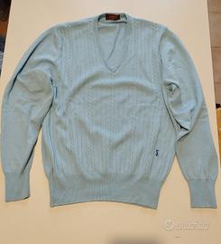 Elegante pullover maglione maglioncino tricot vintage Yves Saint Laurent, con scollo a V e trecce decorative. In lana (manca etichetta della composizione).Colore celeste. Taglia 4 (S/M italiana). Ottime condizioni. Unisex