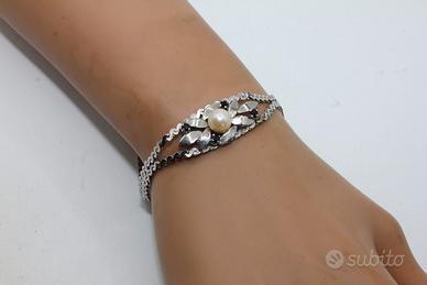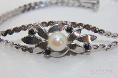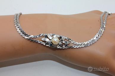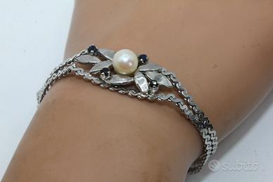Questo incantevole bracciale da donna è un esempio di gioielleria d'epoca dal fascino intramontabile, capace di coniugare la lucentezza dell'argento con la delicatezza degli elementi naturali. Realizzato in argento titolo 835, il gioiello presenta un design armonioso e simmetrico che culmina in un importante rosone centrale dalle linee morbide e floreali. Il cuore della composizione è una perla centrale dalla splendida lucentezza e tonalità naturale, incastonata tra petali d'argento sapientemente modellati. Ad arricchire il decoro troviamo quattro zaffiri blu, posizionati strategicamente per creare un contrasto cromatico profondo ed elegante, tipico della gioielleria di alta classe. Il rosone, che misura 30 x 15 mm, è sostenuto da una doppia catena piatta con maglia lavorata, che garantisce al contempo flessibilità e una presenza scenica raffinata sul polso. Lungo complessivamente 18 cm, il bracciale è dotato di una chiusura a scatto sicura e ben integrata nel design. Come visibile dalle immagini, l'oggetto si trova in ottime condizioni di conservazione, con una patina che ne esalta la lavorazione artigianale e l'autenticità dei materiali punzonati. Un pezzo perfetto per chi cerca un gioiello distintivo che sappia raccontare una storia di eleganza d'altri tempi.
