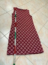 Abito rosso rosa smanicato, in tessuto ricamato con fantasia geometrica a rombi, MALIPARMI, abito invernale, taglia XS, le misure in cm sono riportate in foto. Condizioni ottime.