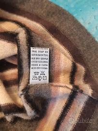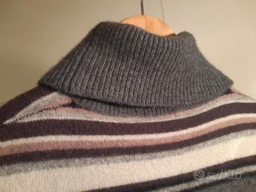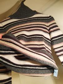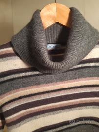 Dolcevita a Malo in puro cashmere a maniche lunghe. Il capo presenta un design a collo alto aderente, con righe orizzontali in tonalità di grigio, bianco, marrone e beige.
