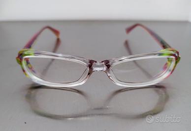 Montatura da vista da donna in acetato multicolore. Include lenti graduate da rimuovere e sostituire con quelle nella misurazione più adatta. Ideali anche come occhiale da lettura. Fornita nella sua custodia originale. NUOVA, mai utilizzata.