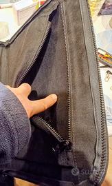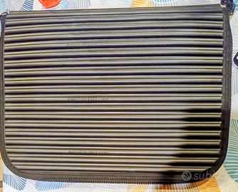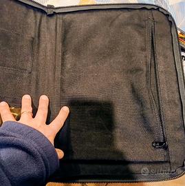 MANDARINA DUCK Tank Bag Cartella, unisex si distingue per la sua funzionalità abbinata a forme minimali e geometriche, caratterizzata da uno scomparto con diverse tasche portaoggetti, vano portapenne un vano con chiusura in velcro, un vano per laptop tipo MacBook air o tablet con chiusura a cerniera. Gancio ad anello per chiavi, ciondoli, ecc. Chiusura con cerniera e anelli per tracolla Fodera in poliestere di colore nero - Tracolla removibile e regolabile con badge porta nome. La struttura è molto robusta, la finitura esterna protegge il laptop dagli urti. Misure da chiusa: Larghezza 43 cm, Altezza 33 cm, Profondità ca. 5 cm Oggetto usato poco e ben conservato, può presentare qualche segno sul rivestimento gommoso esterno visibile solo da vicino.