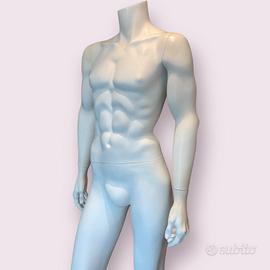 Manichino uomo per esposizione vetrine altezza cm 175 con base sganciabile in acciaio , due posizioni di appoggio possibilità di calzare le scarpe . Braccia e busto mani staccabili , posizione gamba avanti destra quest’ultima staccabile . Possibilità di vestire più taglie .
