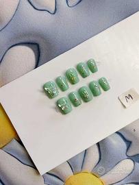 Manicure indossabile, fornita con bastoncino di faggio, salviette imbevute di alcol, strisce adesive e un set di colla gelatinosa (tutto mostrato nella foto), con metodo di misurazione e dimensioni
